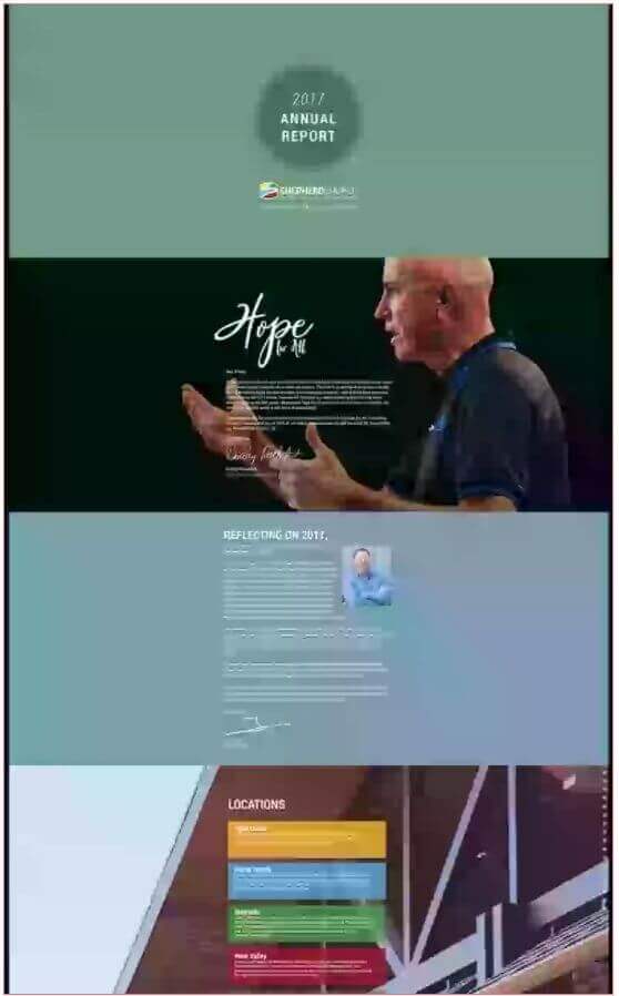 Extra Note: One of the most commonly searched examples of a unique annual report is Elevation Church’s annual report. However, while theirs can be quite fantastic, they set the bar pretty high right from the get-go, and I don’t want to give you unrealistic that you can’t accomplish on your own. I’m going to include it as a note here and focus on some more realistic reports that were still handled really well in my examples.
