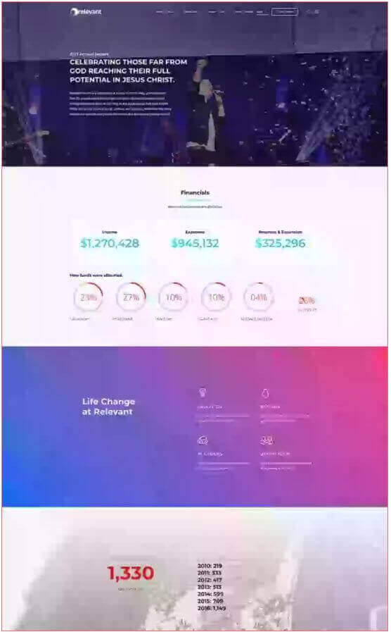 Monetary Statistics: This can include things like tithes and donation totals (given to the church); the amount that the church has given to other causes like missions, programs, or local outreach; costs of events or building projects (include some quotes or testimonials on the stories about what that money went towards!); and so on. The reason I LOVE Relevant’s report is because it’s amazing and they aren’t a megachurch…. Yet.