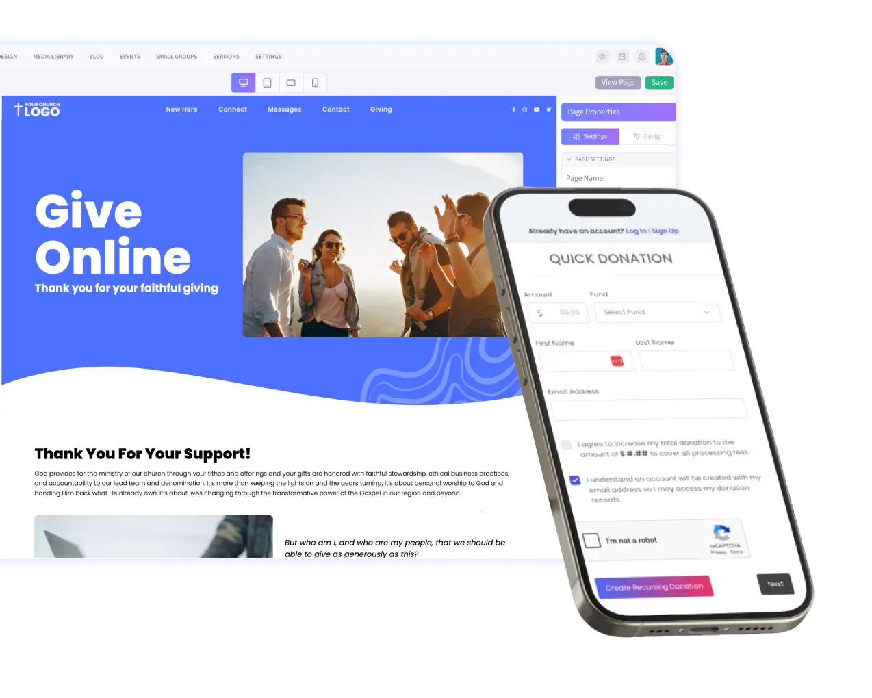 We know every church is different — and so are your giving tools. Our builder doesn’t lock you into a single provider. Instead, you get full control over how and where online giving is featured on your site.